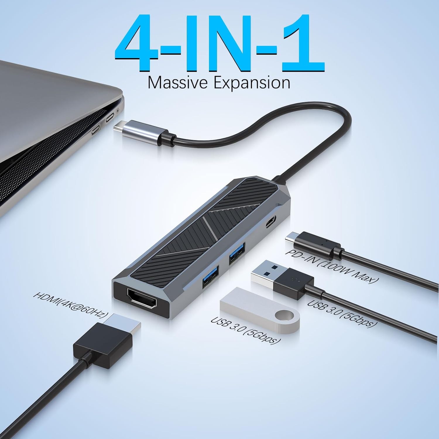 4K 60Hz HDMI স্প্লিটার সহ 4-in-1 USB-C হাব - আধুনিক ডিভাইসগুলির জন্য কমপ্যাক্ট সংযোগ