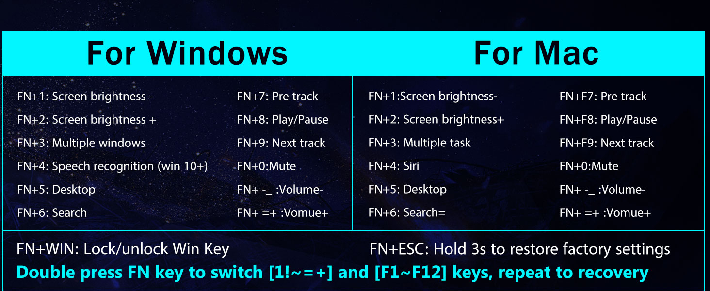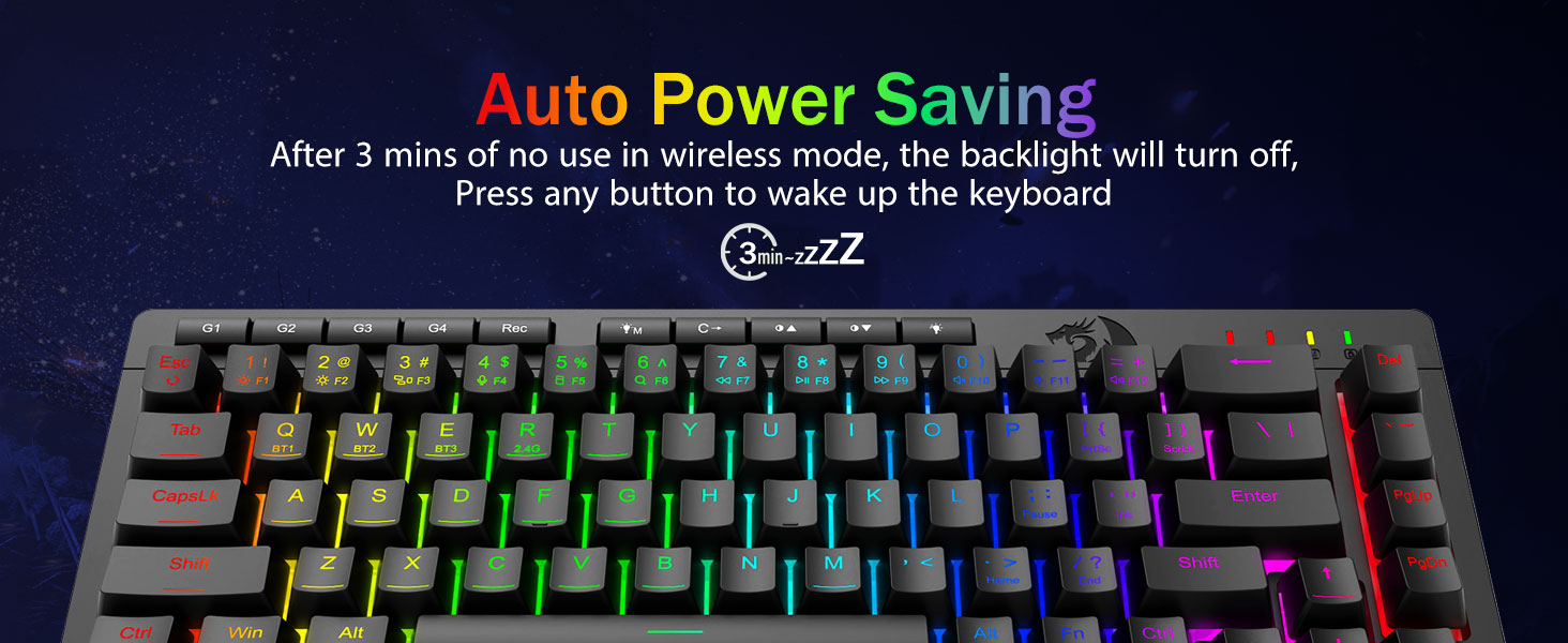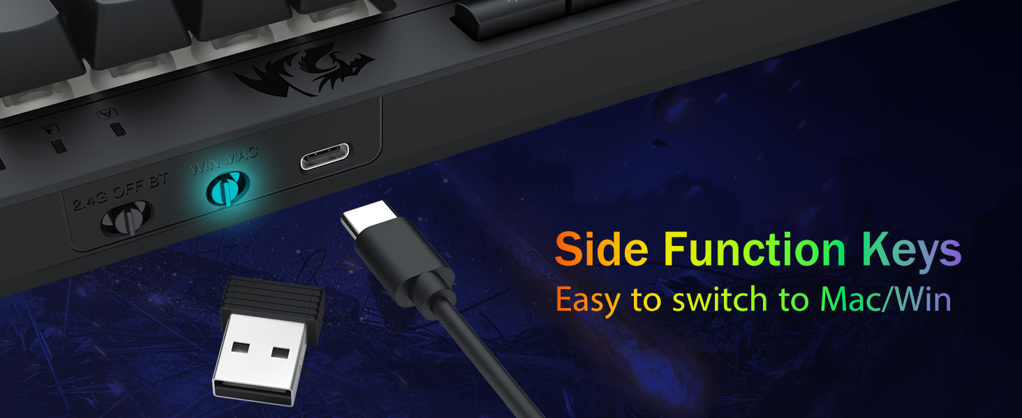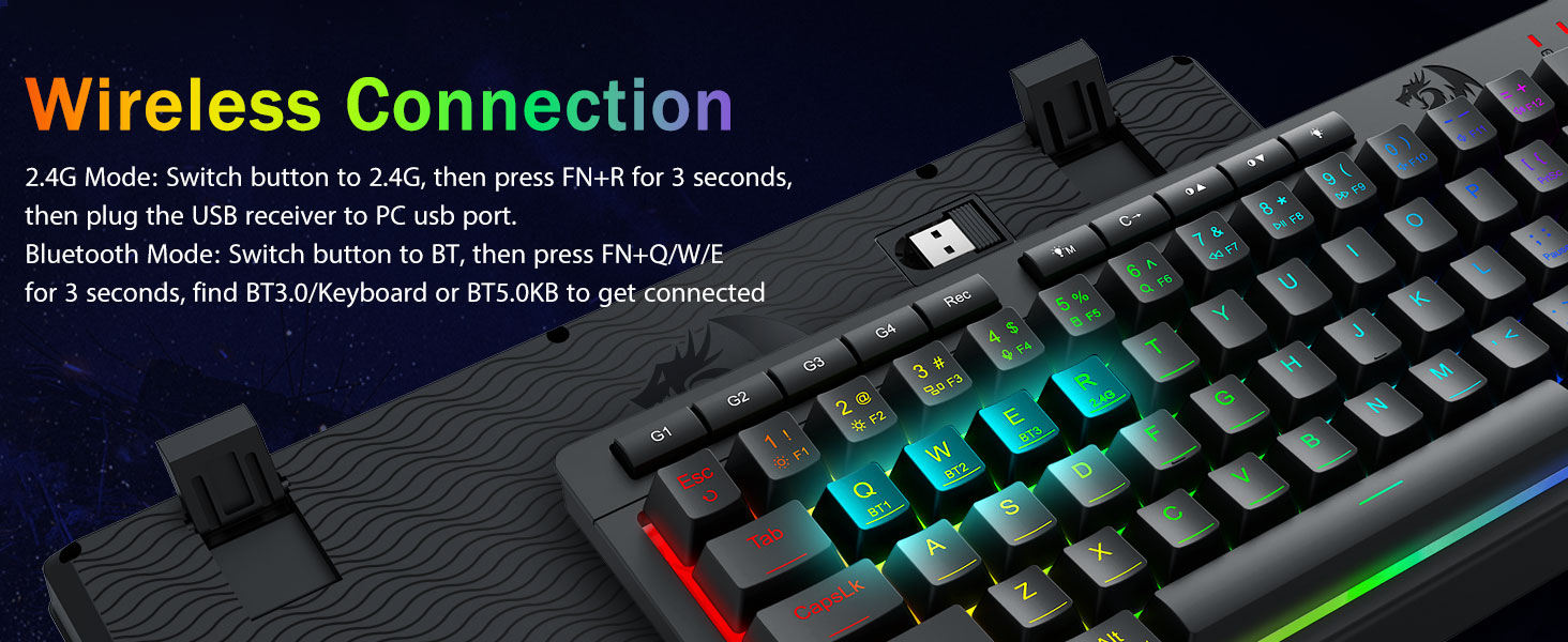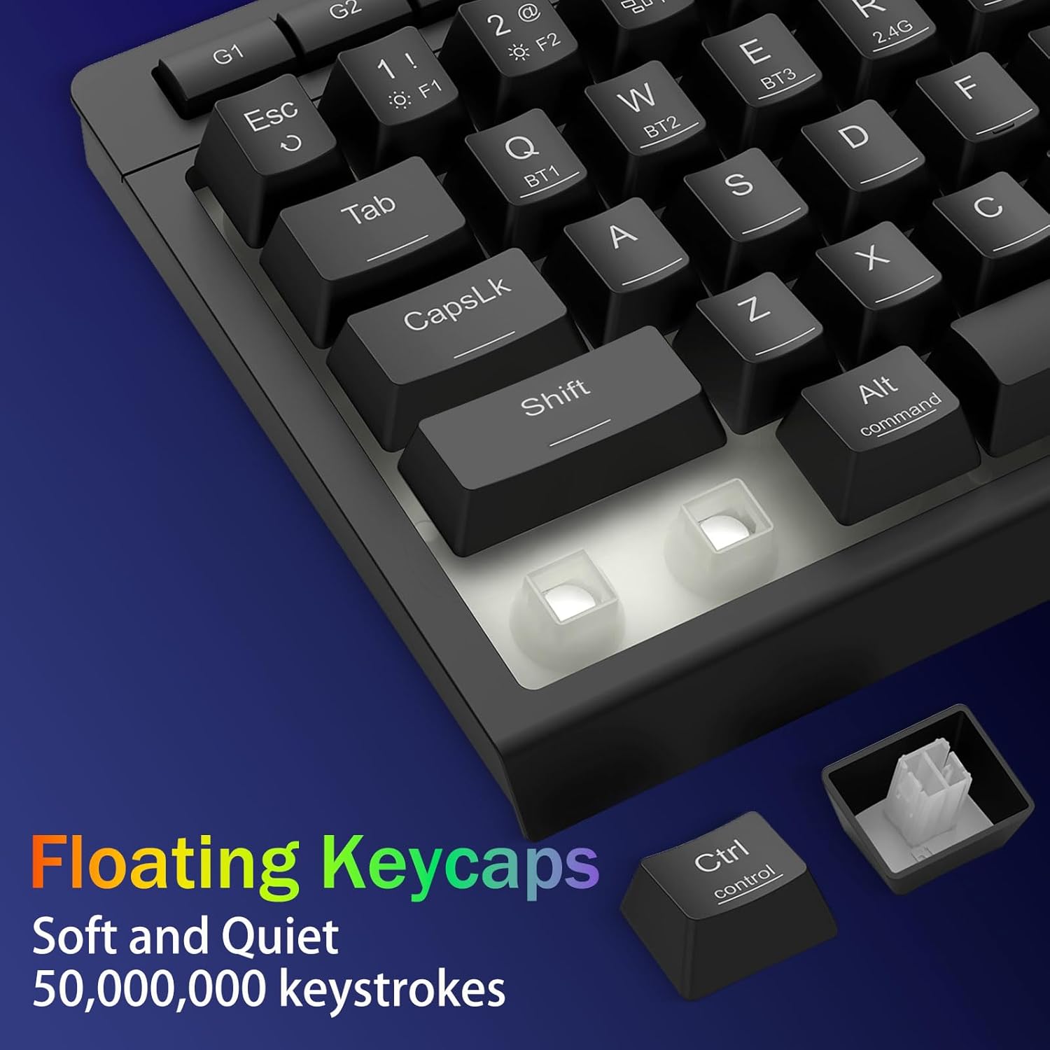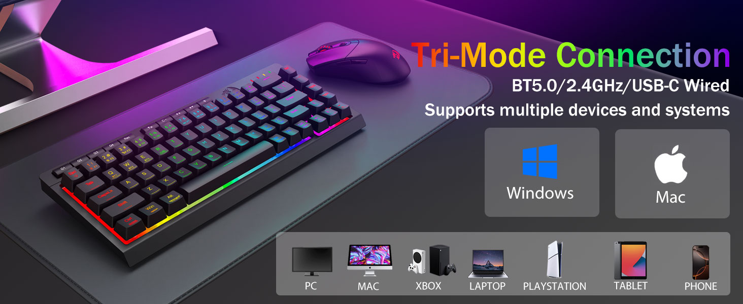 ট্রাই-মোড বহুমুখিতা এবং মাল্টি-ডিভাইস আয়ত্ত -ব্লুটুথ 5.0, 2.4GHz ওয়্যারলেস, বা USB-C ওয়্যার্ড মোডগুলির মধ্যে নির্বিঘ্নে স্যুইচ করুন, একসাথে 5টি পর্যন্ত ডিভাইস সংযুক্ত করুন (PC, Mac, ট্যাবলেট, ফোন, PS/XBOX)। শর্টকাট কী বা সাইড বোতামের মাধ্যমে ডিভাইসগুলিকে অনায়াসে টগল করুন—হাইব্রিড কাজ/গেমিং সেটআপের জন্য উপযুক্ত। 4,000mAh ব্যাটারি (30+ দিন স্ট্যান্ডবাই, 50hrs RGB রানটাইম) সহ সপ্তাহ ধরে চালিত থাকুন।