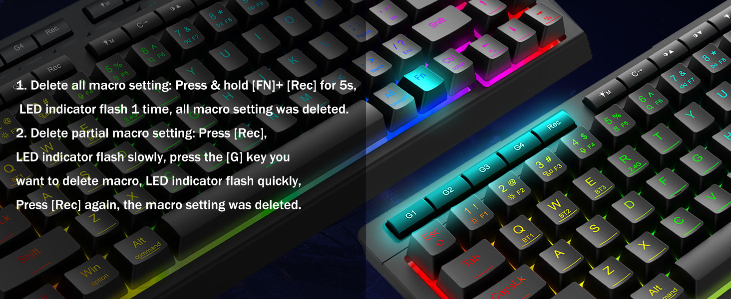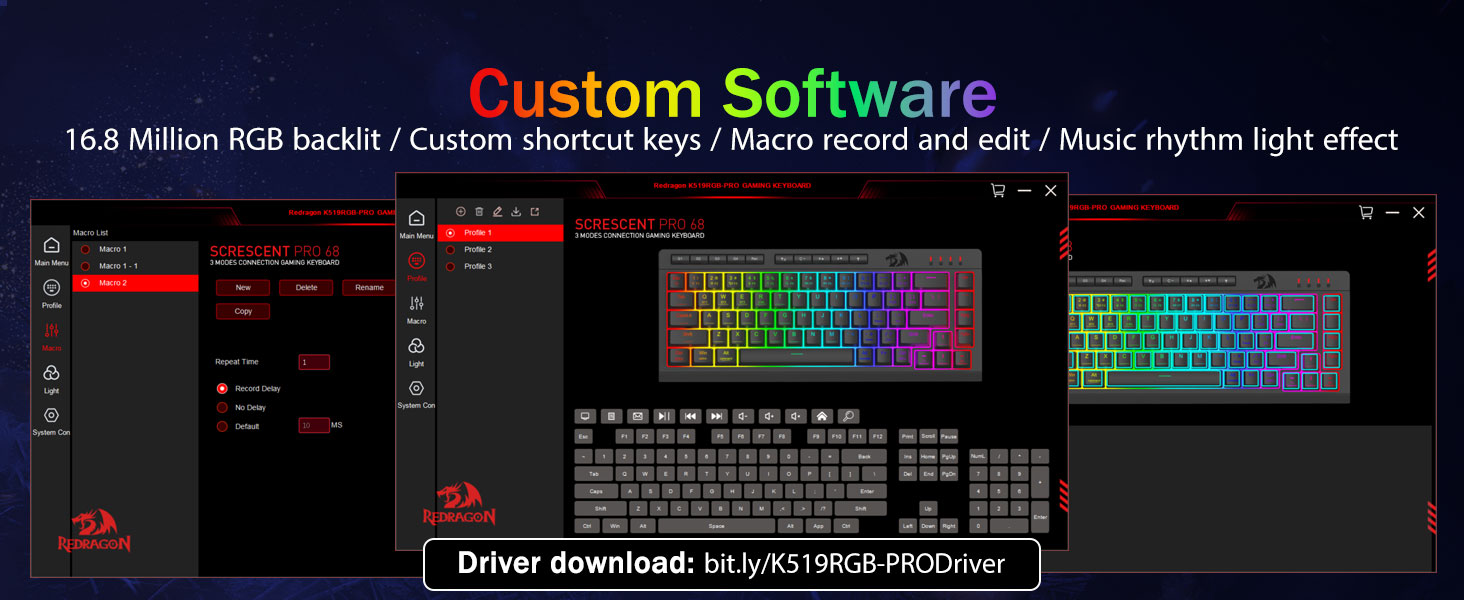 কাস্টমাইজযোগ্য ম্যাক্রো, অনায়াস নিয়ন্ত্রণ -অবিলম্বে 4টি অনবোর্ড ম্যাক্রো কী (G1-G4) প্রোগ্রাম করুন—কোন সফ্টওয়্যারের প্রয়োজন নেই৷ গেমিংয়ের জন্য জটিল কম্বো, উৎপাদনশীলতার জন্য শর্টকাট বা মিডিয়া কমান্ড রেকর্ড করুন। সেকেন্ডের মধ্যে আপনার কর্মপ্রবাহ পুনরায় সংজ্ঞায়িত করুন। আপনি ফাংশন কাস্টমাইজ করতে, ম্যাক্রো তৈরি করতে, আরজিবি লাইট সামঞ্জস্য করতে এবং শর্টকাট সেট করতে সফ্টওয়্যার ব্যবহার করতে পারেন। সফ্টওয়্যার লিঙ্ক: bit.ly/K524RGB-PRODriver