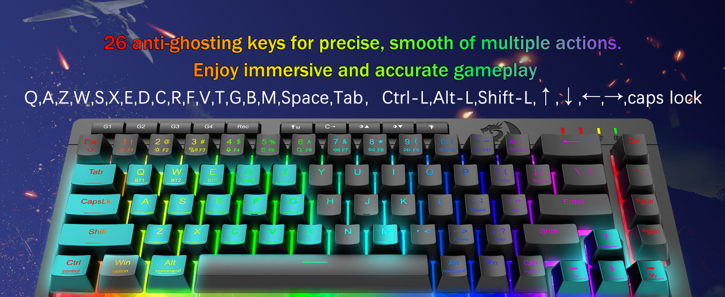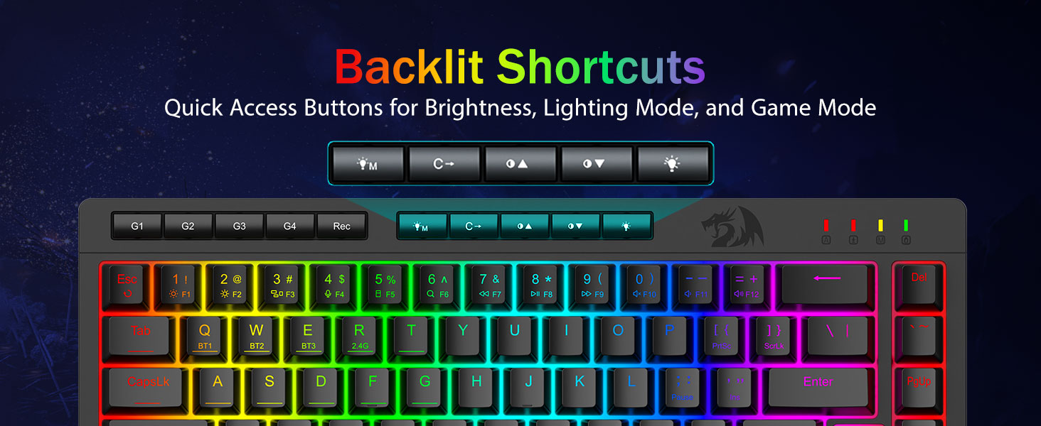 প্রো-গ্রেড গেমিং পারফরম্যান্স এবং ডেডিকেটেড ব্যাকলিট নিয়ন্ত্রণ -অ্যান্টি-গোস্টিং কী (আন্ডারস্কোর সহ কী) বৈশিষ্ট্যযুক্ত যা আপনার ইচ্ছামত দ্রুত এবং নির্ভুল গেম প্রতিক্রিয়ার জন্য 26টি কী একসাথে কাজ করার অনুমতি দেয়। উজ্জ্বলতা, লাইটিং মোড এবং গেম মোডের জন্য দ্রুত অ্যাক্সেস বোতামগুলি দ্রুত উজ্জ্বলতা, আলোক প্রোফাইলগুলি সামঞ্জস্য করতে এবং একটি বাটোর স্পর্শে গেম মোড সক্ষম করতে।
