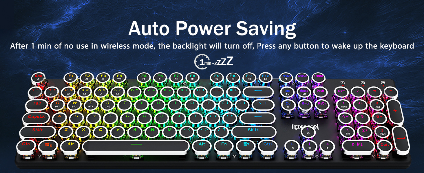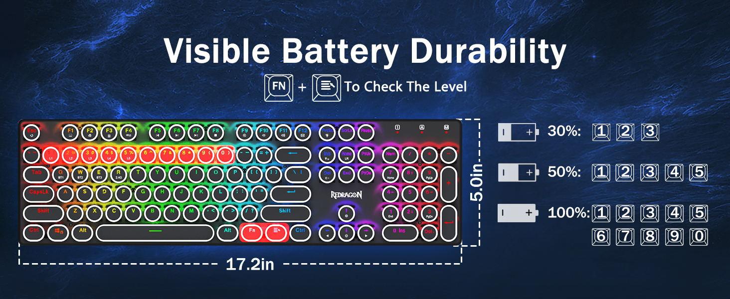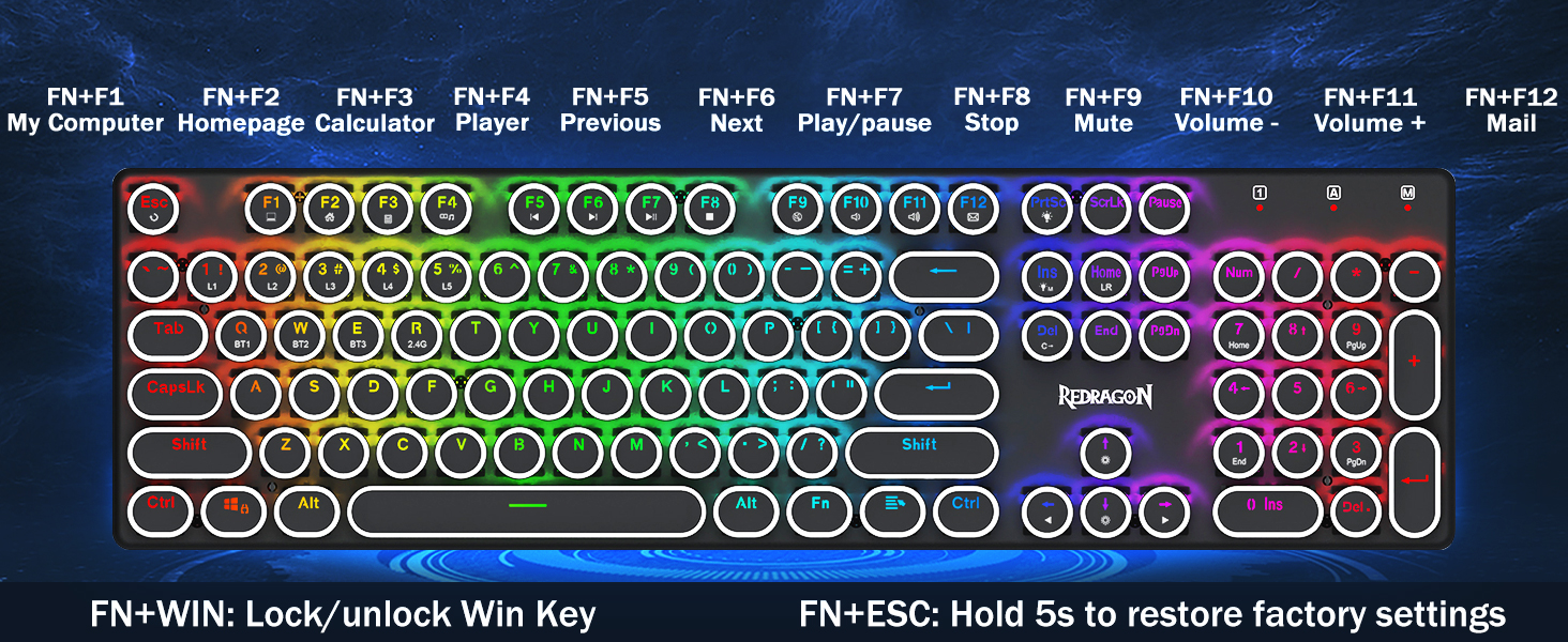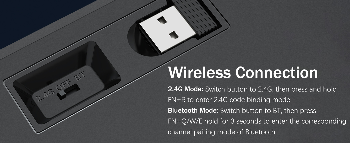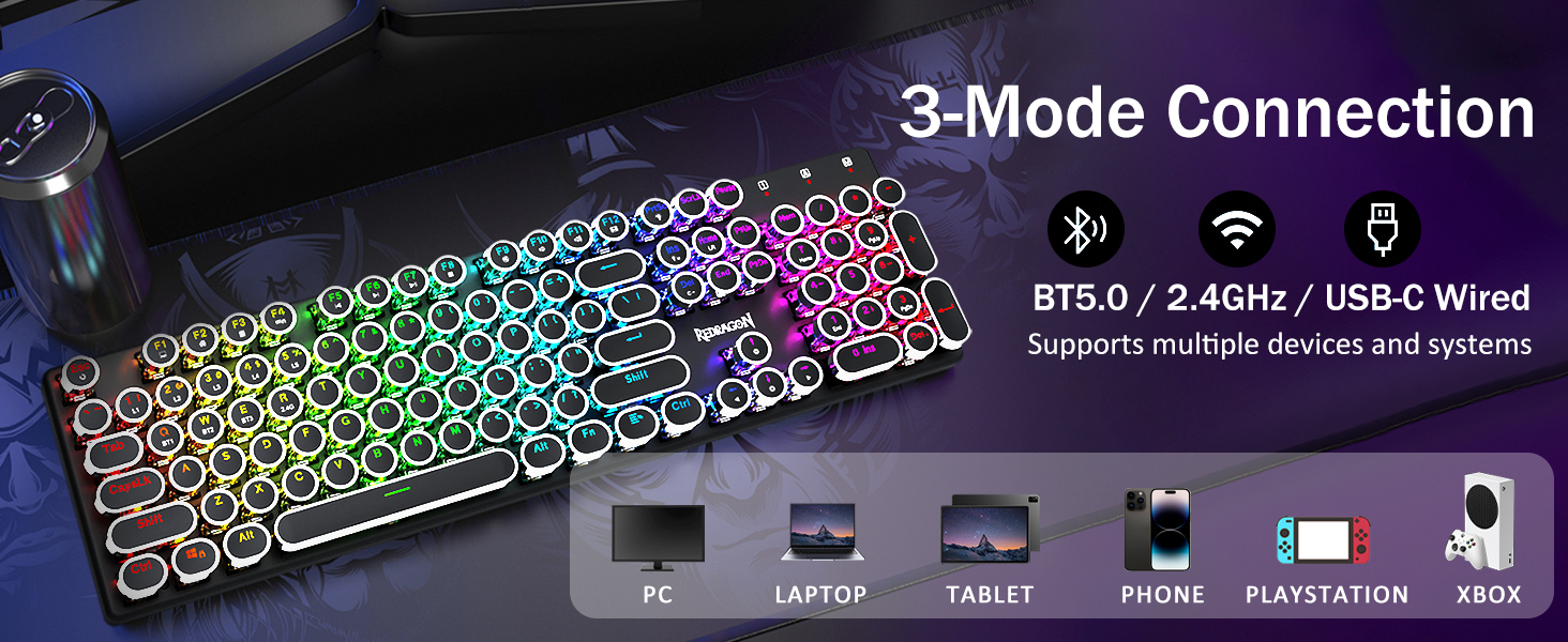 𝟯-𝗠𝗼𝗱𝗲 𝗖𝗼𝗻𝗻𝗲𝗰𝘁𝗶𝗼𝗻 -রেড্রাগন উদ্ভাবনী ট্রাই-মোড সংযোগ প্রযুক্তি, ইউএসবি-সি তারযুক্ত, ব্লুটুথ 5.0/3.0 এবং 2.4 গিগাহার্জ ওয়্যারলেস মোডগুলির সাথে তৈরি যা ব্যবহারকারীর অভিজ্ঞতাকে সমস্ত ক্ষেত্রে অন্য স্তরে আপগ্রেড করে। ব্লুটুথ মোডে FN+Q/W/E টিপুন, 2.4G মোডে FN+R টিপুন।