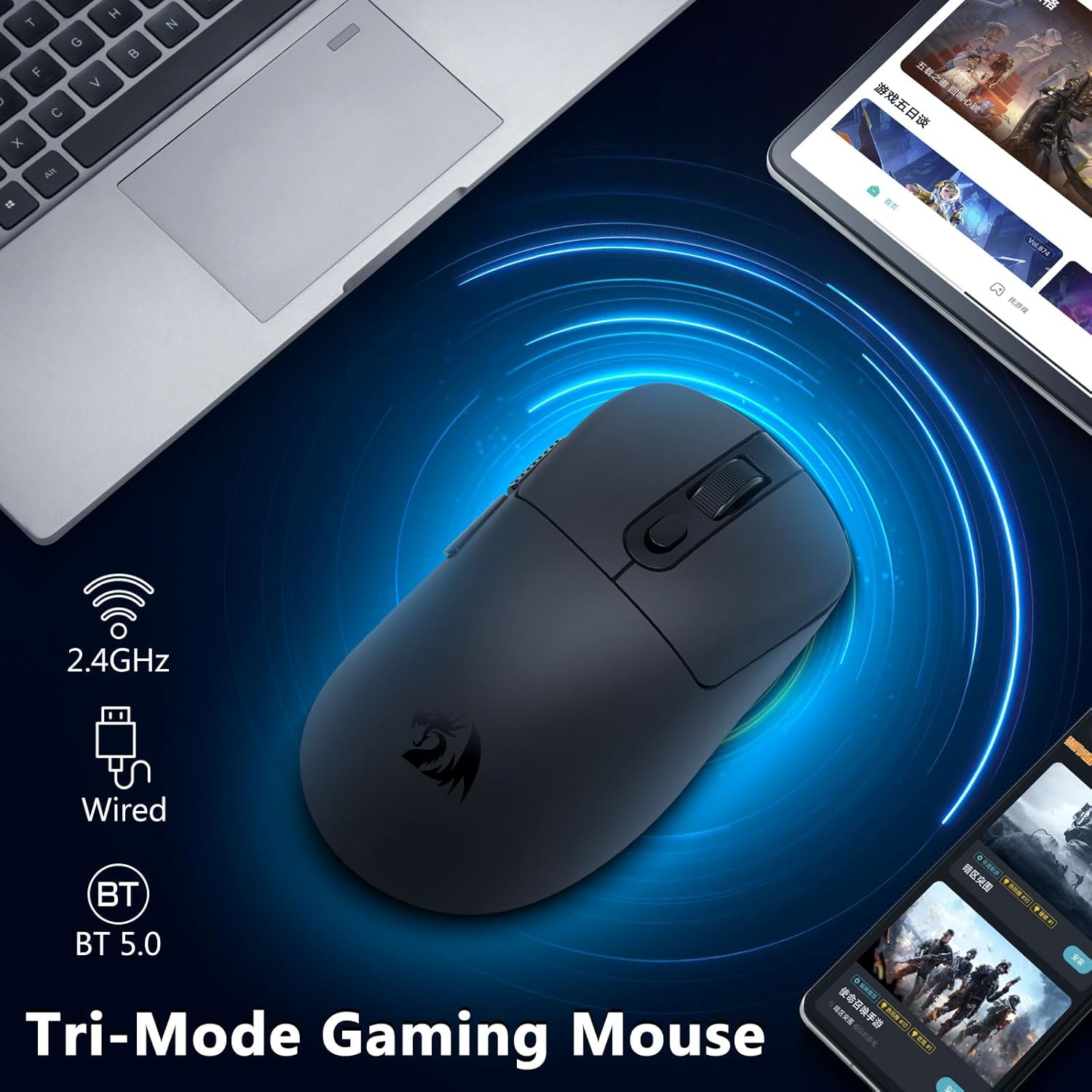 চুয়াংকুয়ান ব্ল্যাক এম818 ওয়্যারলেস 24,000 ডিপিআই, ট্রাই-মোড 2.4জি গেমিং মাউস সুনির্দিষ্ট ট্র্যাকিং, নমনীয় সংযোগ এবং মসৃণ নিয়ন্ত্রণ সরবরাহ করে, গেমার এবং পেশাদারদের গতি, নির্ভুলতা এবং নির্বিঘ্ন মাল্টি-ডিভাইস পারফরম্যান্সের জন্য আদর্শ।