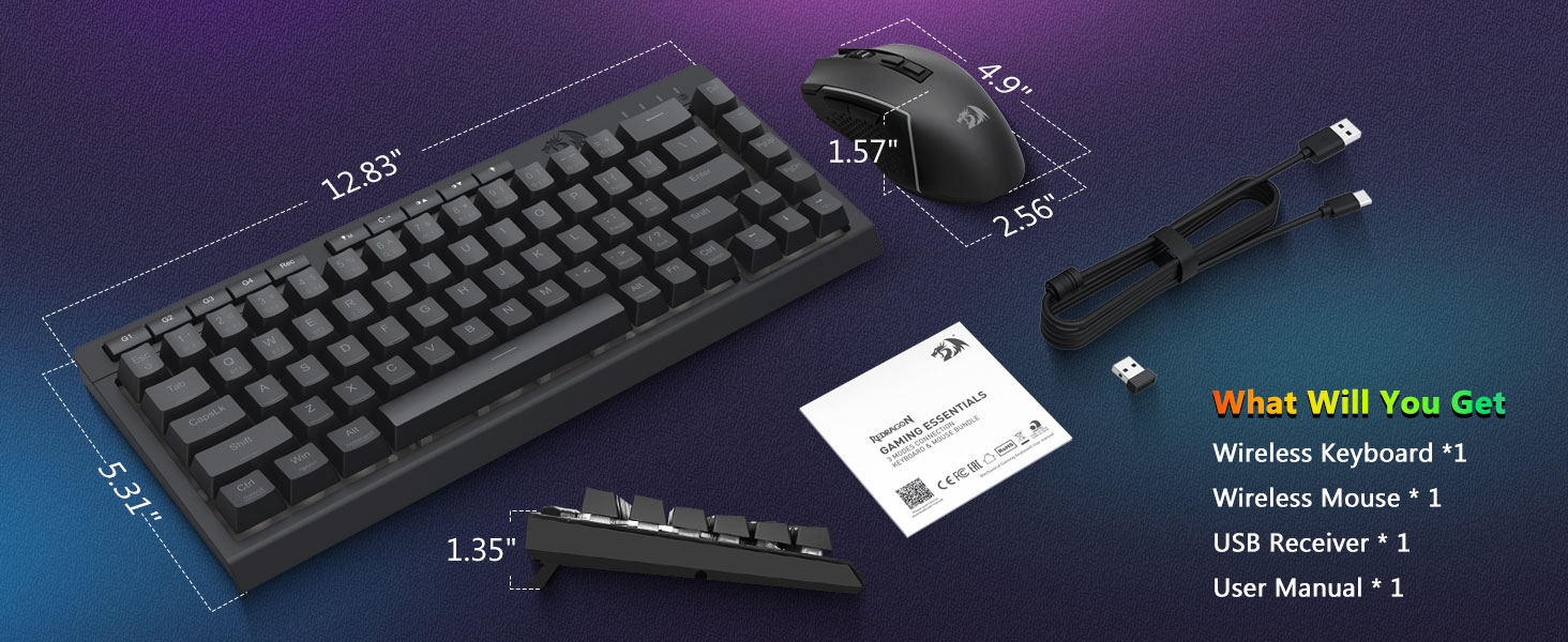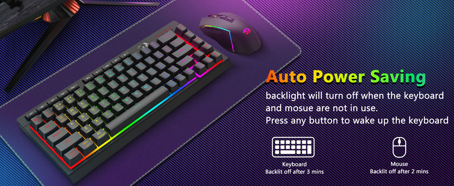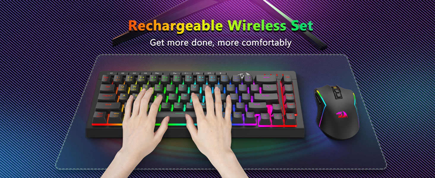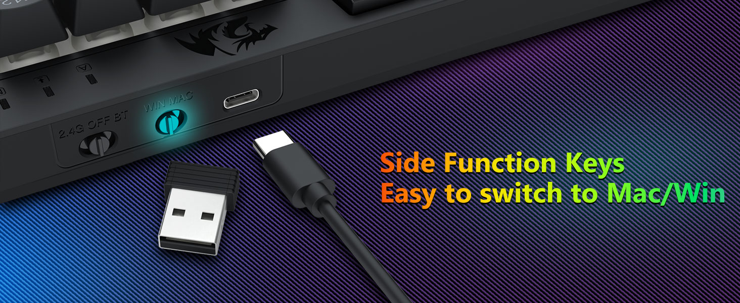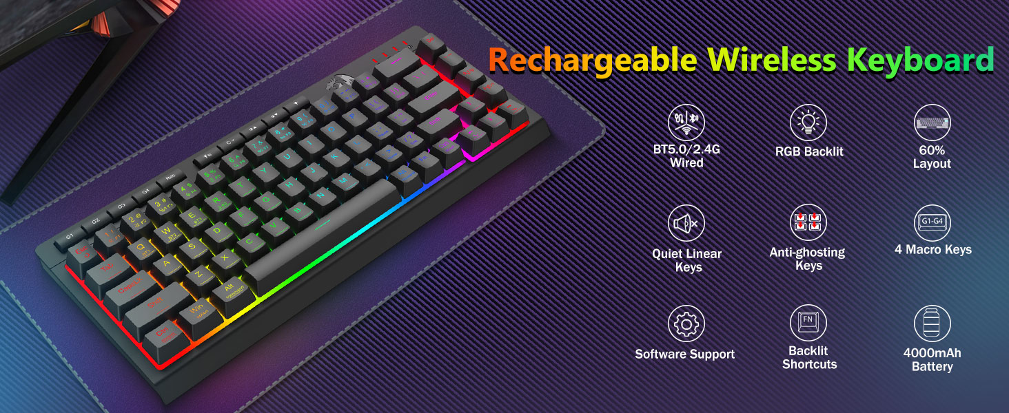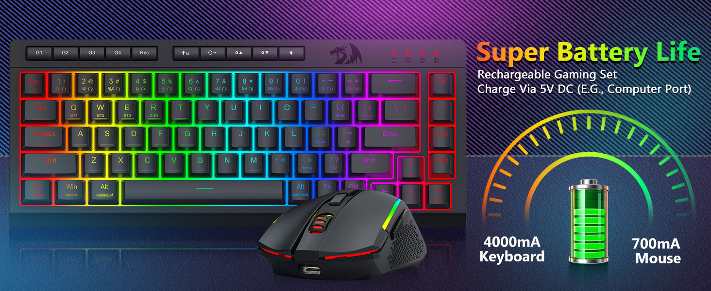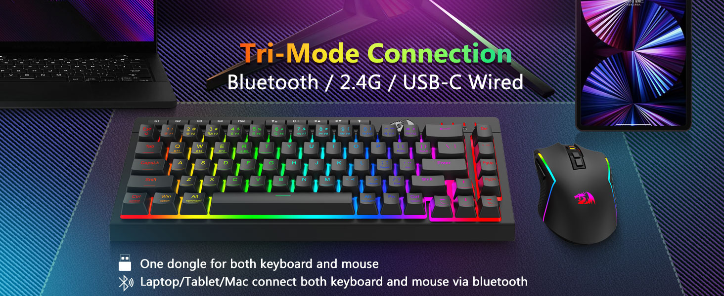 ট্রাই-মোড বহুমুখীতা কীবোর্ড এবং মাউস- ব্লুটুথ 5.0, 2.4GHz ওয়্যারলেস, বা USB-C ওয়্যার্ড মোডের মধ্যে বিরামহীনভাবে স্যুইচ করুন, বিভিন্ন ডিভাইসে (PC, Mac, ট্যাবলেট, ফোন, PS/XBOX) সংযোগ করুন৷ শর্টকাট কী বা সাইড বোতামের মাধ্যমে ডিভাইসগুলিকে অনায়াসে টগল করুন—হাইব্রিড কাজ/গেমিং সেটআপের জন্য উপযুক্ত। 4,000mAh ব্যাটারি কীবোর্ড এবং 700mAh ব্যাটারি মাউস (30+ দিন স্ট্যান্ডবাই, 50hrs RGB রানটাইম) দিয়ে সপ্তাহের জন্য চালিত থাকুন।