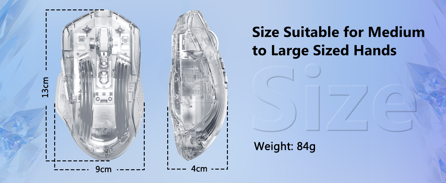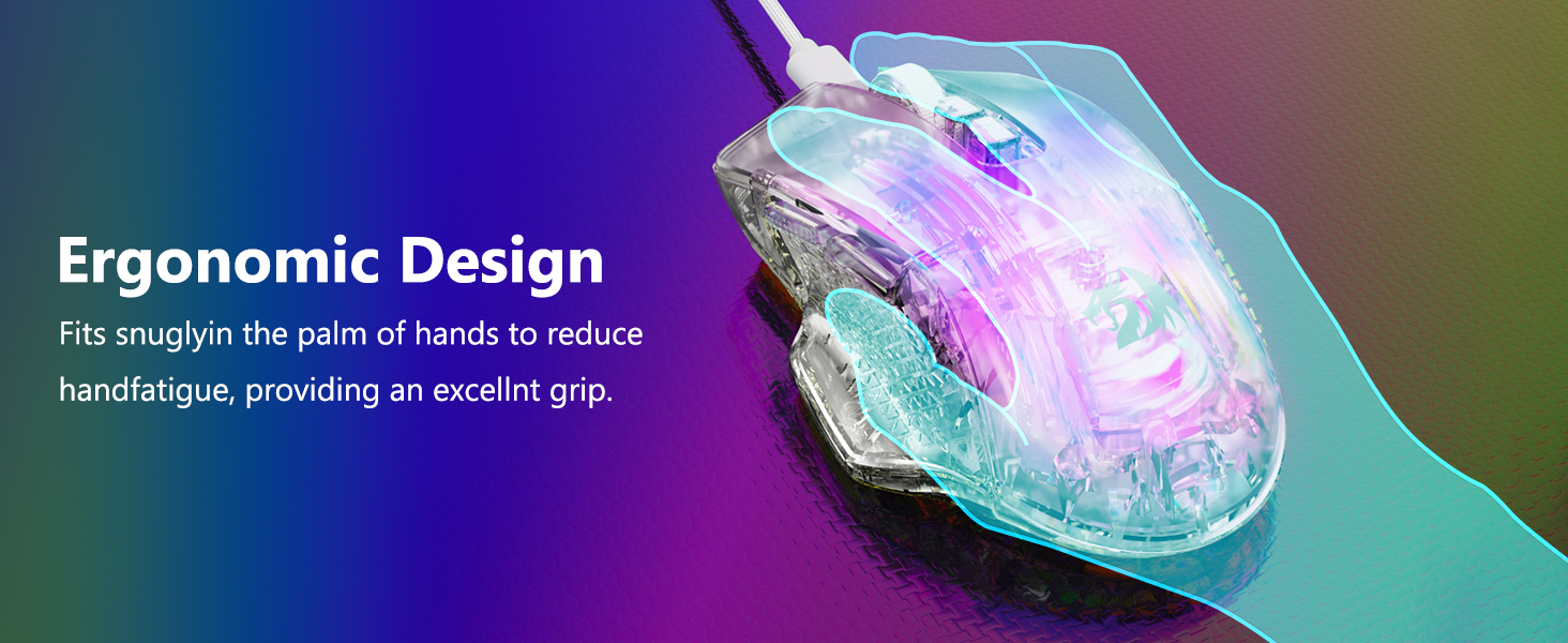 মাউসটি স্বাভাবিকভাবে হাতে ফিট করার জন্য আকৃতির, অতিরিক্ত চাপ ছাড়াই বর্ধিত ব্যবহারকে সমর্থন করে। এর গঠন আরামদায়ক গ্রিপ শৈলীর জন্য মঞ্জুরি দেয়, যার মধ্যে তালু, নখর এবং আঙুলের ডগা গ্রিপ রয়েছে।