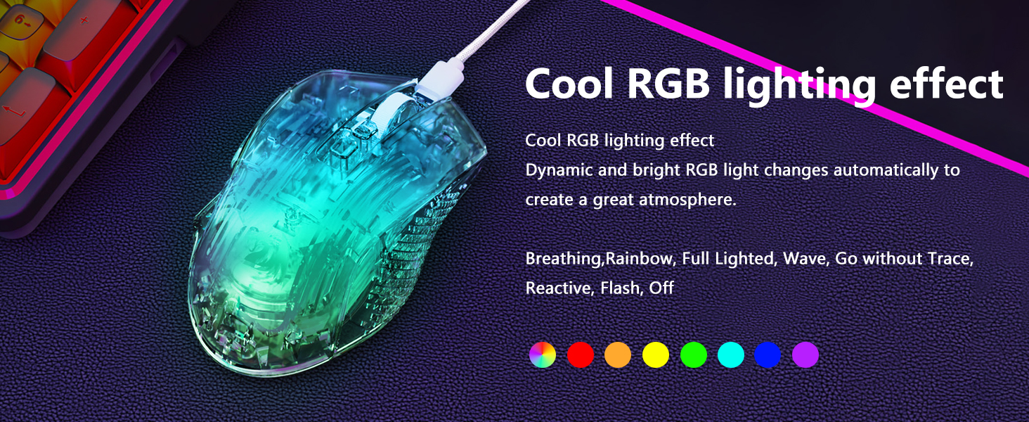 মাউসটিতে আটটি আরজিবি লাইটিং ইফেক্ট রয়েছে যা কর্মক্ষমতা প্রভাবিত না করেই ভিজ্যুয়াল আবেদন বাড়ায়। ব্যবহারকারীরা তাদের সেটআপ বা ব্যক্তিগত পছন্দের সাথে মেলে আলোর মোডগুলির মধ্যে স্যুইচ করতে পারেন।