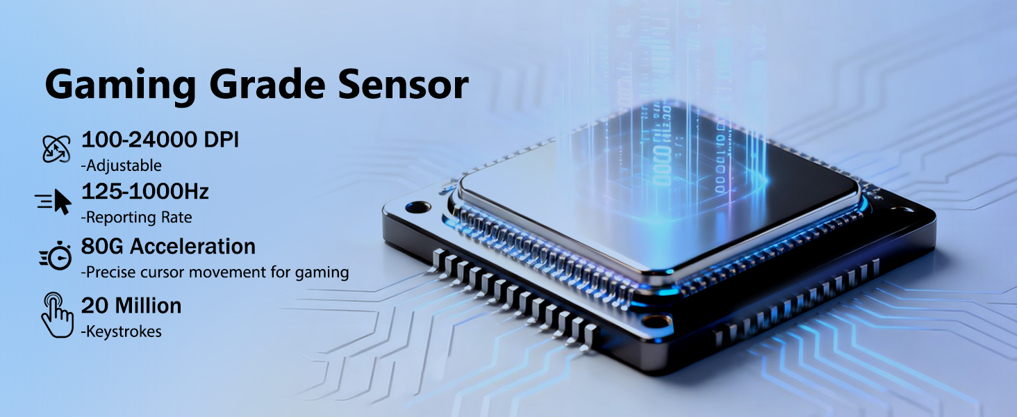 মাউসটি 24,000 DPI পর্যন্ত পৌঁছতে সক্ষম একটি উন্নত অপটিক্যাল সেন্সর দিয়ে সজ্জিত। এটি ব্যবহারকারীদের বিভিন্ন পরিস্থিতিতে সংবেদনশীলতা সামঞ্জস্য করতে দেয়, গেমগুলিতে সুনির্দিষ্ট লক্ষ্যবস্তু থেকে বড় স্ক্রীন জুড়ে দ্রুত কার্সার চলাচল পর্যন্ত।